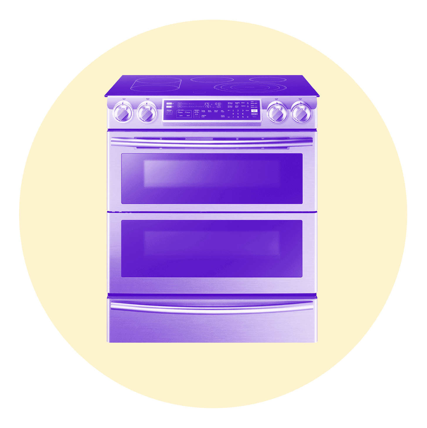 Yellow circle with a purple icon of a portable induction cooktop inside. There is a nonstick pan on top of the cooktop.